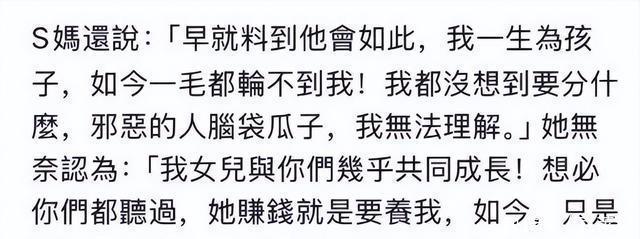 大S已去世的情况下,S妈仍能当着媒体说出“大S赚钱就是为了养她”这种话,可见,原生家庭是大S一生的负累,为了S妈,为了姐姐妹妹,大S累垮了,年仅48岁郁郁而终。